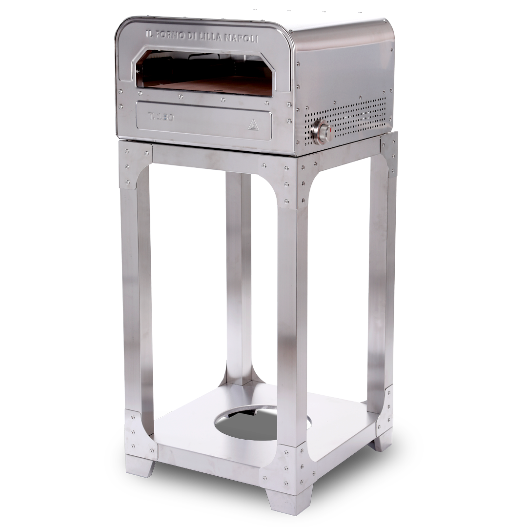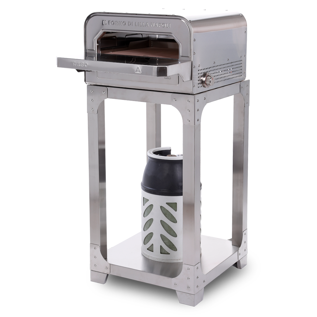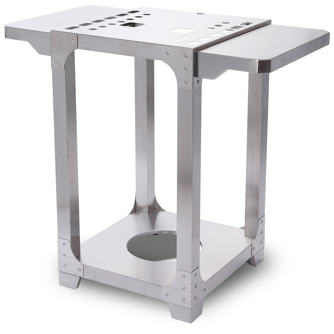 På sidan av stativet kan man även placera samma bord som sitter framför ugnen för avlastningsyta.